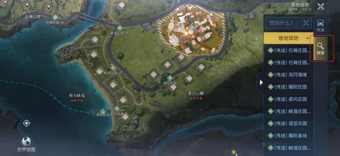 由于游戏地图大,传送点数量多,萌新虽然已经解锁目标区域,但是一时半会儿记不住目标区域属于哪片领地,可能就会有【传送】界面中找不到目标名称的情况出现。因此我们可以使用【搜索】功能来解决这一问题,辅助使用【传送】功能。