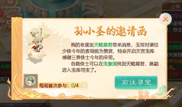 有了,经典玩法“天宫寻宝”!每天14点-14点10分参与天宫寻宝副本,击败守将抢宝盒,就能获取不错的养成道具