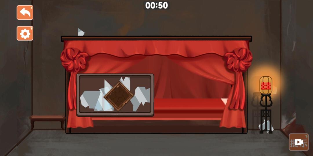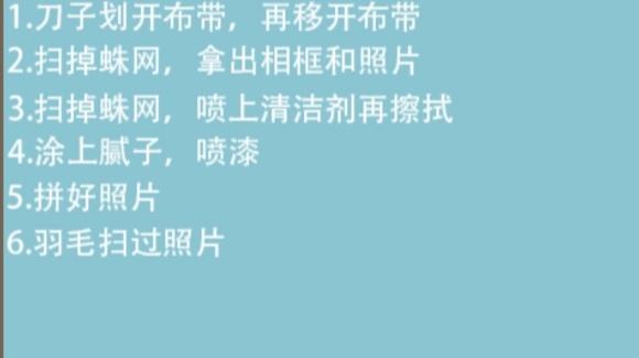 然后出现一个方形的木盘子,点一下帘子里面的相框,再点场景内的玻璃碎片。(灯后面还有一个,别落下了)