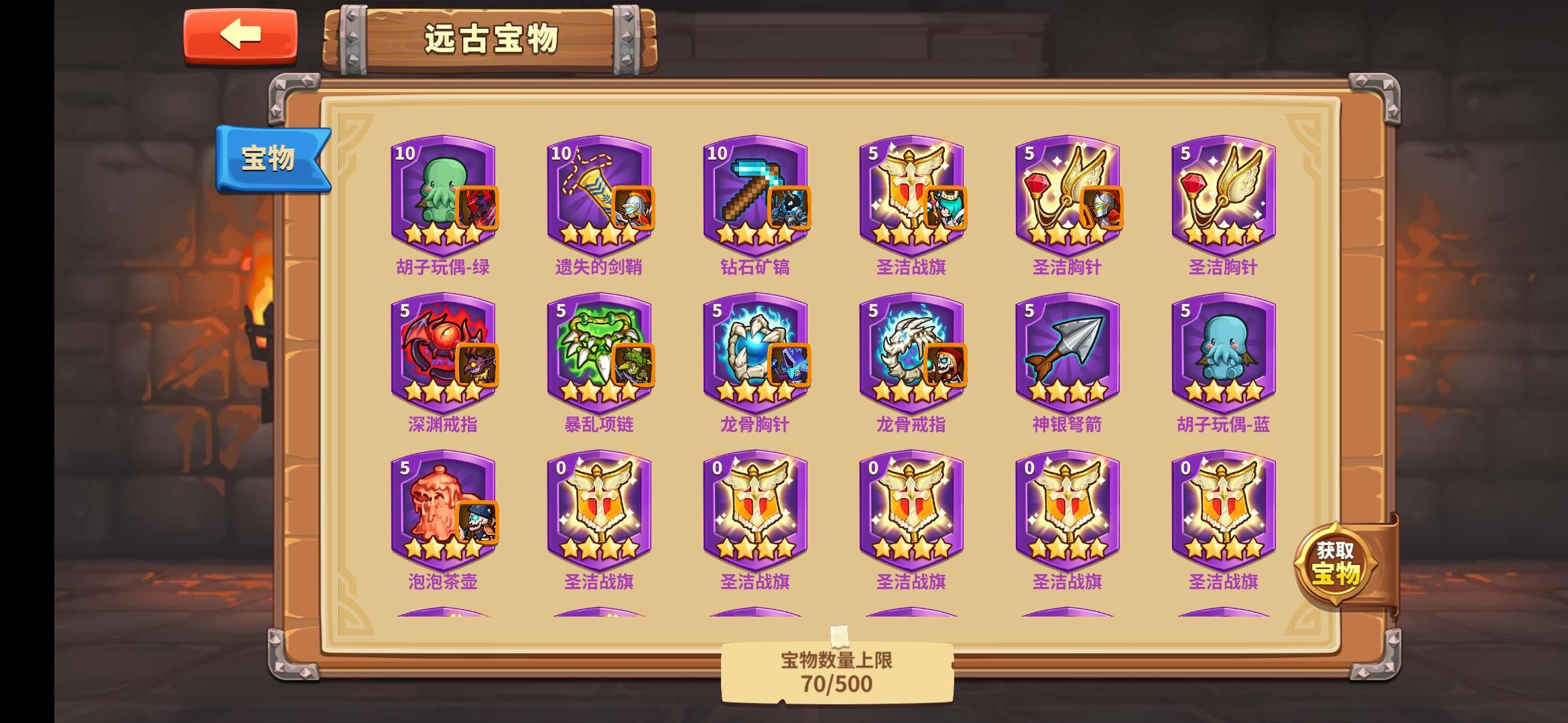 接下来就是通过5-20开启宝物副本了,这里就是第二个微氪点了,买18RMB2次紫色鉴定的礼包,鉴定出2个哥布林套装宝物即可,同一部件也可以。然后一个给哥炮,另外一个哥骑。微氪到此结束,运气好,68搞定。剩下的靠时间慢慢来吧。