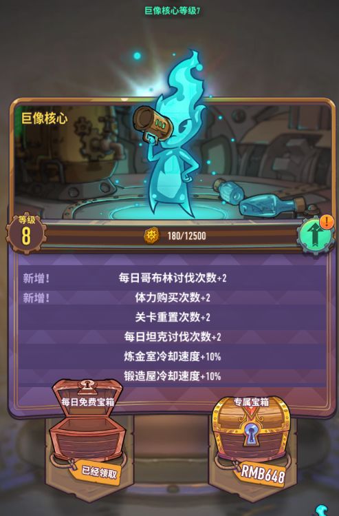类似其他游戏的vip系统。不过良心的是可以用钻石/能量升级,白嫖玩家狂喜。随着巨像等级的提升,每日礼包的奖励也会上升,并会获得各种资源产出增益。这里的话根据个人选择决定前期投入多少钻石升巨像核心,我推荐2(坦克讨伐数+1)4(体力购买次数+1)7(坦克本+2)8(每日礼包5稀有万能)这几个等级。氪佬请无视直接上15。另外个人建议低中氪不要着急上10。先把主要养的稀有骑士升到5星再做考虑。