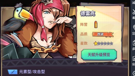 T0.5德雷克 首充送的传说,技能组相当优秀,无论是1技能的全体刮痧(怪物的被击召唤不会触发)还是2技能的再次行动都是操作空间非常大的技能。配合天赋的单体加伤,boss杀手。