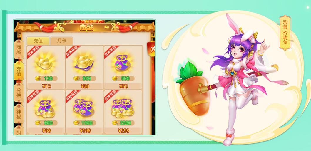 游戏中每档元宝首充都是有双倍回馈的!而且完成第一笔首充时,还可以获得一只珍兽玲珑兔,她是咱们新手开荒的优秀伙伴,有了她在副本挑战中会更加轻松。