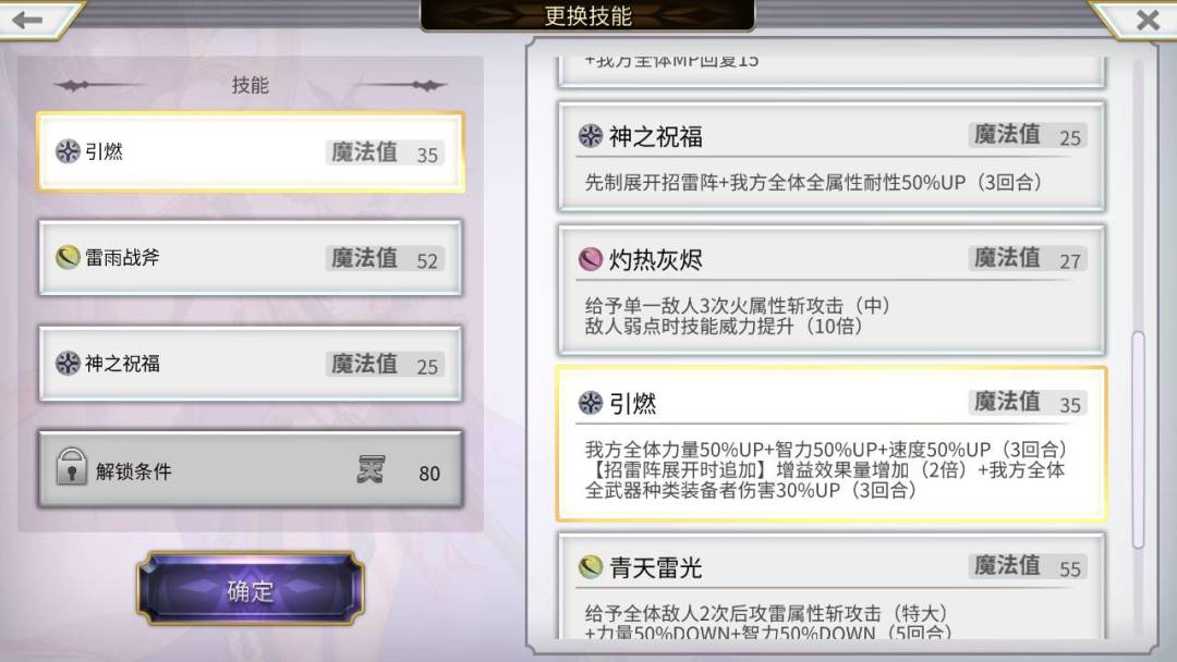 引燃:我方全体力智速50%up,雷阵展开追加:增益效果增加两倍。我方全体武器种类装备者伤害30%up。