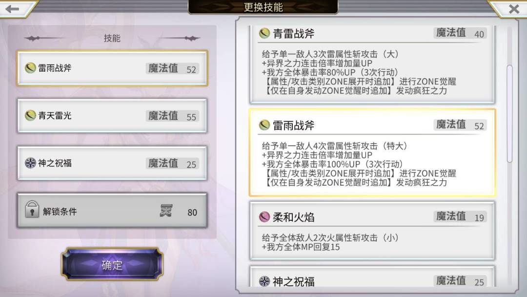 雷雨战斧:条里面连击率up,我方全体暴击几率100%三次行动,还能觉醒阵,在自身发动zone时追加,发动疯狂之力。