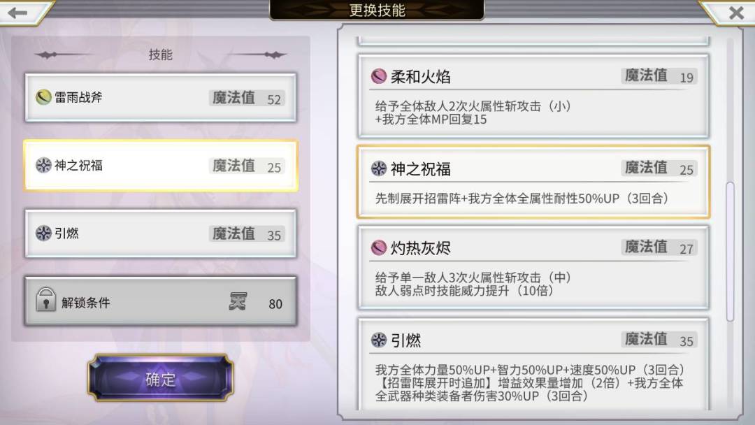 神之祝福:先制展开雷阵(af条也行),我方全体全属性耐性50%up。