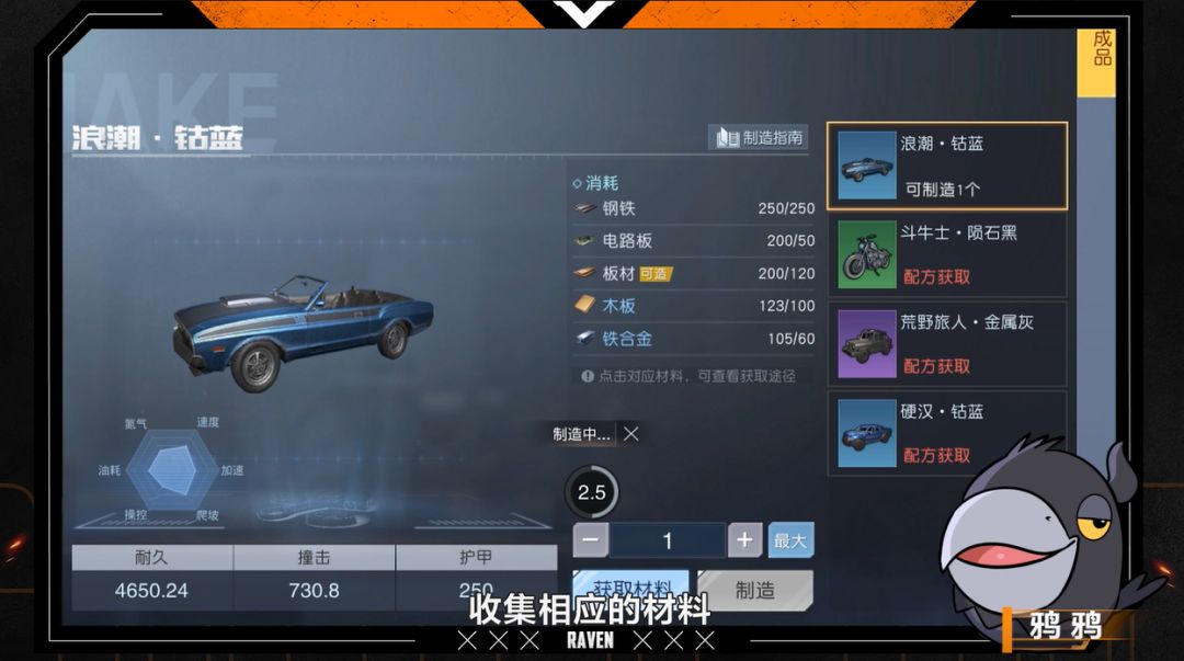 需要注意的是,就算图纸到手了也还不能造出载具。造车还需要玩家们收集所需的材料,像是木板、板材、电路板、钢铁、钛合金等。