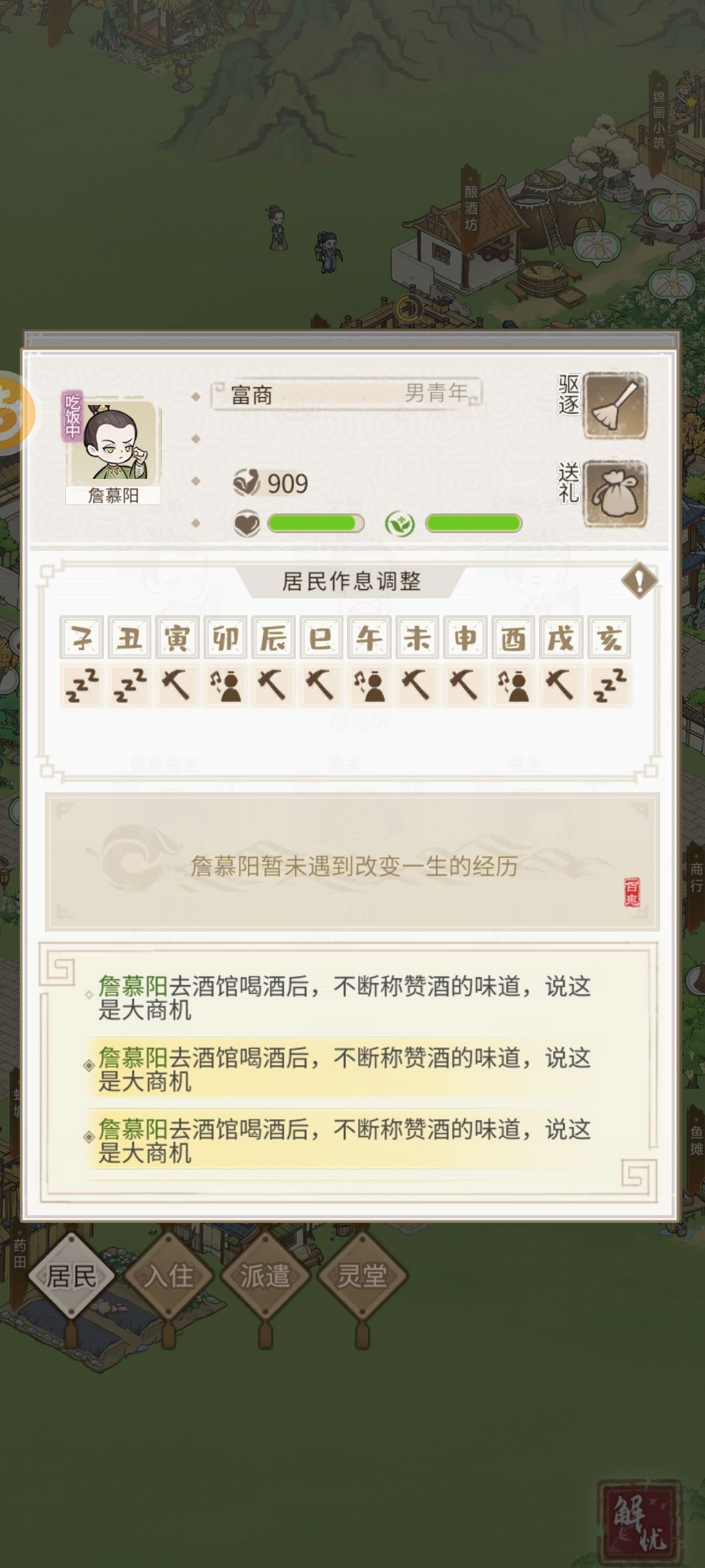 而且很多不同名字的干的是一样的活,比如钱庄老板、账房先生和富商都是可以在钱庄干活的,那就在居民属性里显示一下呀,不然只能去每个建筑里点击更换的时候才能看到这个建筑有哪些人适合在里面干活,就很麻烦。