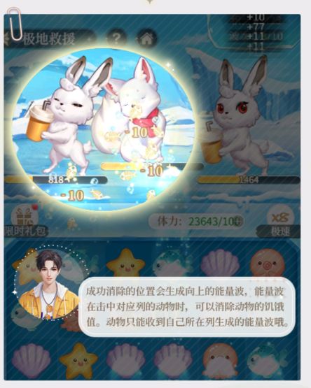 消除海洋生物可生成能量,能量可以减少场上被救助动物的饥饿值,被救助动物只能收到对应列的能量,被救助动物成功收到能量时,根据收到能量的次数会获得额外的极地冰晶奖励。