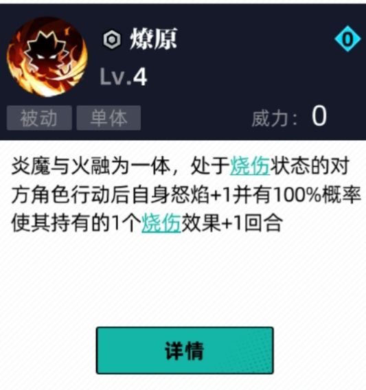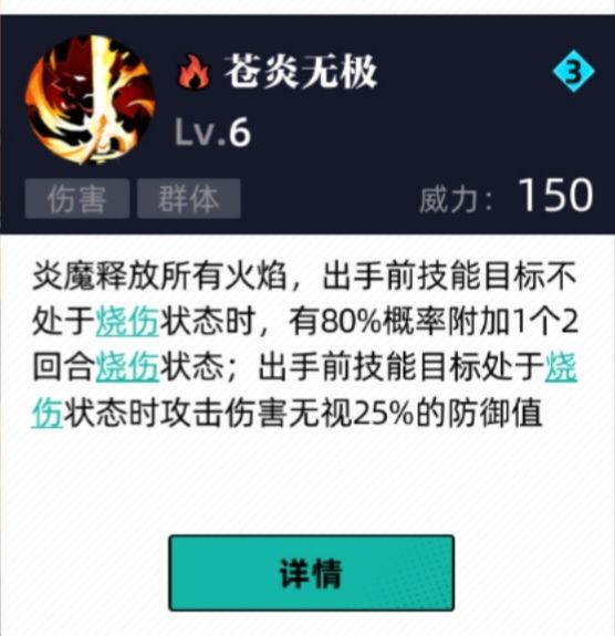 群体高伤,对点燃目标拥有25%穿防效果(和暴击套穿防无法叠加,测试过了),高概率使无点燃目标点燃