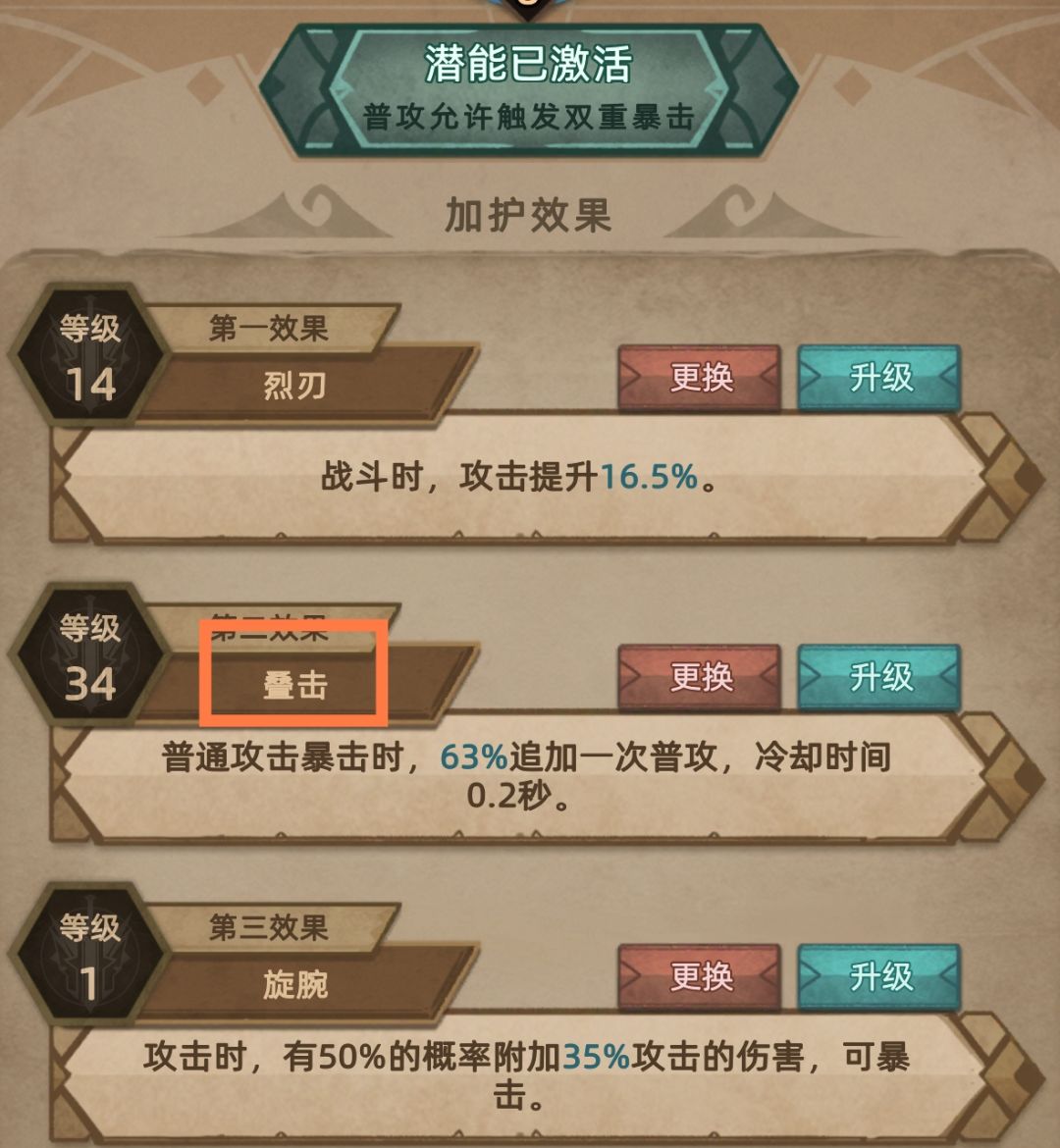 把叠击升满,其他可有可无(那个双重暴击技能会减暴击率所以先不戴)
