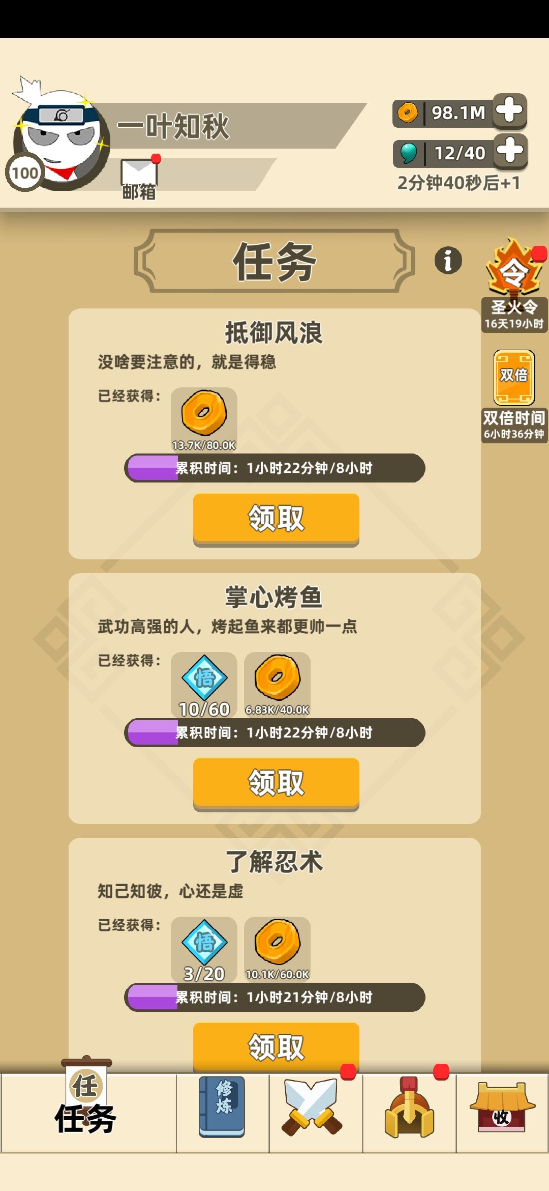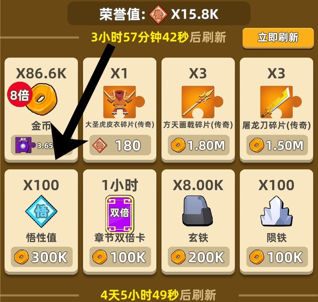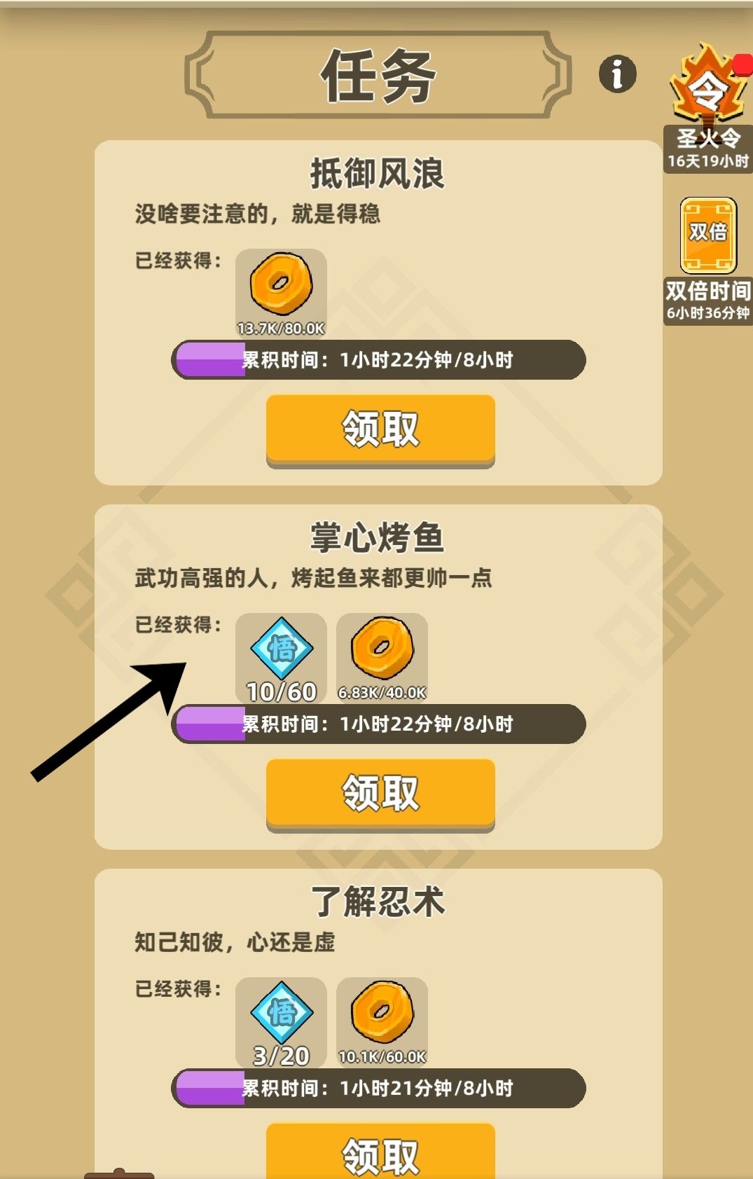 2)任务双倍卡只有一种时长,8个小时,刚好是一个任务刷新的时间,我们可以靠这张卡领取两次的任务,第一次在领取双倍卡前已经八小时任务做完,第二次在差不多八小时时领取,这样就可以领取到差不多670的悟性!