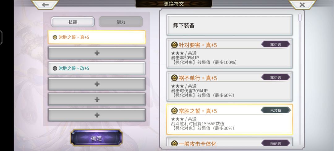 设定一个常胜之誓-真+5,每场战斗结束会获得60点af条,还需要一个常胜之誓-改+5即可实现每一轮战斗都拥有Af条。如下图所示。