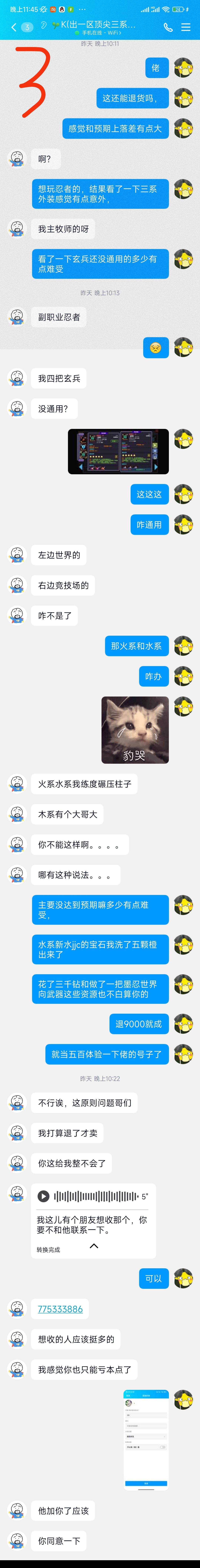 k总平时不是总发什么号细节吗,什么全满魂珠,40w满氪号,我又想回一区陪曾经那帮人玩玩,碍于面子和他们公会多少有点冲突以及想给曾经公会兄弟们一个惊喜,拿了小号去跟他谈买号这事,拉了个小号没怎么讲价小刀9500rmb给他号买下来了后来吧想着都是顶配的人也都有面子,压根没想到他平时装的和他本身号压根没半毛钱关系,魂珠稀烂如图,氪度7.8w,我觉得心理不是很平衡,因为你虚假宣传,每天重复你的号多么多么牛逼,多么多么顶配,这是你自己承认的吹牛逼的,我提出退款没什么问题吧,他不接受,然后推给我一个他的朋友想收他的号,一聊天想六千收走,我算了一下玩了一晚上,消费了点资源,一去一回🕳️我三千五?说不定还是两个人说好的,欺骗当时身份牌是萌新的我?(当时还不知情我是饼干,因为拉我进破虹公会群去了)然后我还是找了k佬说我要退款,开始说也没有戳破他平时对外盗图**实际号况不符这件事,就单纯只是跟他和声和气说退款并且消耗的资源按1000价格补偿给他,我给了他账号密码去验号,然后咬死要我一千九的补偿 ,上号本来出于对顶配玩家的信任并没有检查大部分资源,做了一把忍者世界武器洗了jjc的宝石出五颗橙毕业,前提都是有效提升,这些不说提升不提升,如果退号肯定花了资源我给钱,我当时是想说,玩你一晚上号,花了200武器币,3000钻,补给你一千当我体验了一下号,k佬直接开口说一颗武器币100钻武器币按20000钻石算其他算下来200币3000钻没1900rmb这事没完,现在我也不在乎那点逼钱了,号不退,亏了就亏了,只不过k总,你知道我是饼干之后就立马找某位佬扭曲事实企图让人站队帮你说话,和别人说的你一开始看我态度好就同意退款,然后因为价格接受不了而拒绝这件事,是不是有一点前后不一呢,你为什么答应退款,是因为你心中的小算盘都打好了吧,仁者见仁,智者见智,这件事我就是让大家看清所谓k佬的嘴脸就行。