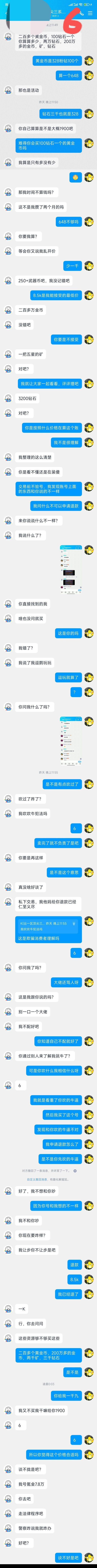 上图内容概括:k验完号之后,对使用的资源进行了清算,但价格问题,k坚持将黄金币这些能白嫖的资源,按照最贵的钻石商城价算,连按粉钻价算都不行,这不是圈钱是什么呢?我不同意这么算,并质问他账号和宣传不一样的事,k胡搅蛮缠说自己吹牛又不犯法,还骂了脏字,谈不拢之后k就不搭理我了