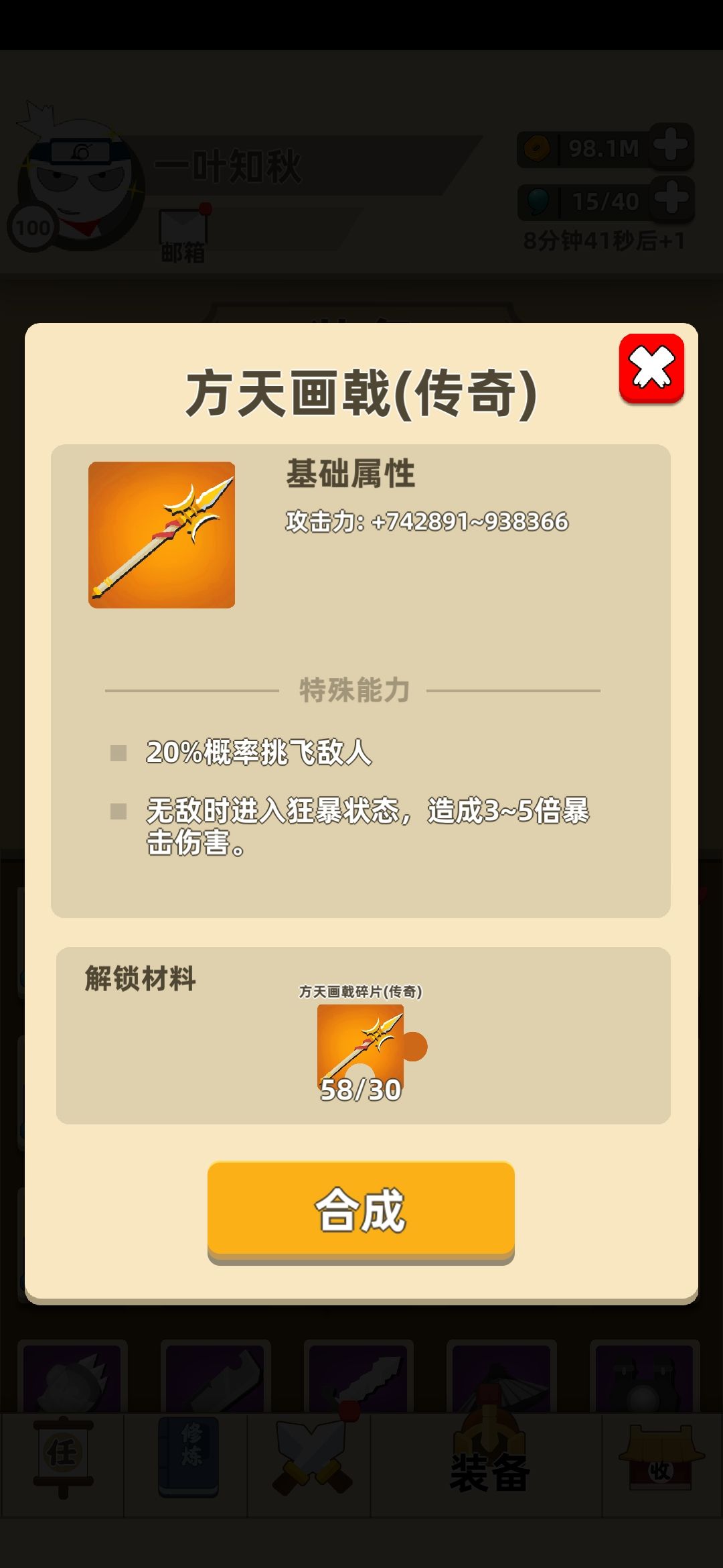 5)方天画戟,能配合罩子打出五倍暴击伤害,简称三秒真男人,能够击飞除了胖子与boss以外的所有怪物,击飞几率还算凑合,除了打蓬莱还是没有什么大用,不太建议去换。建议搭配虎皮加斗笠或者头箍。(普通副本霸主,大侠副本下水道)