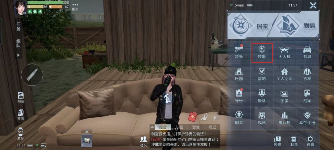 技能可以在主界面的【菜单】栏中找到。打开【菜单】栏后,就可以在第一排找到【技能】键了。