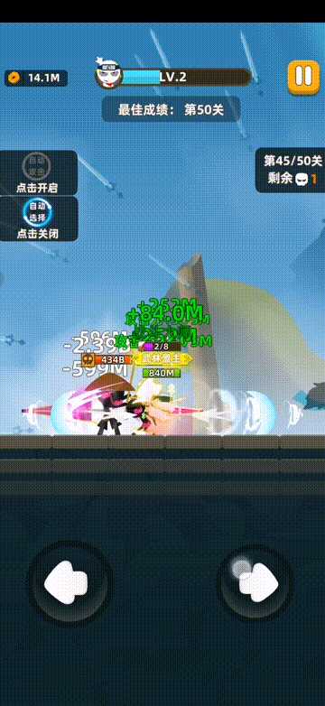 之后和尚跳右,大剑和和尚大部分情况是同身位的,砍两刀后撤,之后毒箭会出现然后射出毒箭封了两边,记得在原位后撤一步当毒箭锁定射出后直接上去打和尚,如果射出位置刚好在和尚前一个身位就是不要砍和尚了,直接砍毒箭,一般一直砍和尚是可以把毒箭打死的,如果没打死也无所谓,等待下一波的输出。 第二波的飞剑下落必须要躲避,这时候的和尚和飞剑都是在左边的,直接跑一段距离躲避激光不要太远,因为之后飞剑会自己跳起来,和尚还是在左边,我们可以直接过去砍他,这一波如果是屠龙可以不管那个飞剑。 之后又是一波飞剑下落在你背后,继续上前砍和尚。三秒之后和尚跳左,飞剑在身后,跟第二波一样的操作,之后就是重复,不贪刀怎么都能打过去,建议点一个三十暴击直接把和尚两轮秒了或者点六个盾保一下命,第48关也是一样的操作,和尚的血要厚一些。