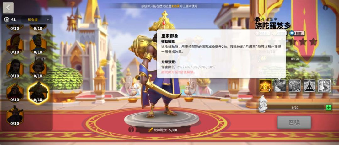 首先皇家御象的技能发挥与据点完全绑定,换个角度说,基本上无论是野外的团战还是反集结上,这个技能都毫无作用可言;其次是伤害减免固然强大,但是也需要适当防御属性,生命属性作为支撑才能够达到很好发挥,旃陀羅笈多,正好就缺乏稳定防御属性来支撑起伤害减免效果发挥,需装备补救