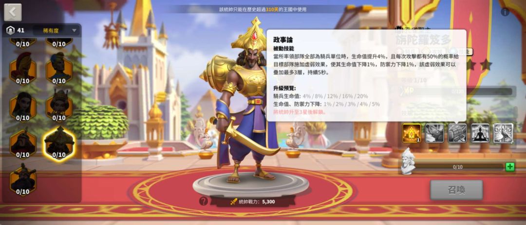 对于旃陀羅笈多吼姆个人是保持观望态度的,虽然技能有些超模,但其余技能表现拉胯相互制衡,算是个相当平衡的统帅,是否能对李舜臣有威胁?他是有希望但也不过仅此而已;他既保持了一定的灵活,能与各种骑兵配对;也因本身8的特殊性质致使仅能够起到不至于超出规格之外的表现,技能苦行便是如此
