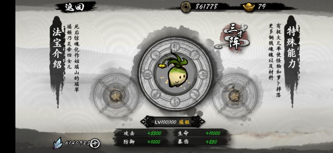 第六是法宝,手残通过不了身法试炼,好久之后才知道可以用元宝买法宝,于是买了一个瑶姬,每天在修为试炼里面攒太华初精把瑶姬升到满级,然后打六道和关卡的时候,铜钱和魂魄翻倍涨。记得,神荼试炼开了的时候就去修为试炼攒太华初精,这样就可以多多赚钱和魂魄,摩多摩多。其他的元宝不够,没有买,但是也没有影响通关,放心吧。