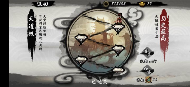 第五是八卦牌,六道轮回获得,紫色和金色的少有,一般在第五或者第10关掉落。洗练原来是可以选择属性的,六个空空就是用来选择的,要注意把A牌的属性洗练到B牌上去的时候,A牌的属性一定要比B牌的属性高,不然洗过去就会降修为,除了少数防御洗练到攻击的特殊情况之外。通关的时候大部分是紫色,也有一些金色牌,不多。