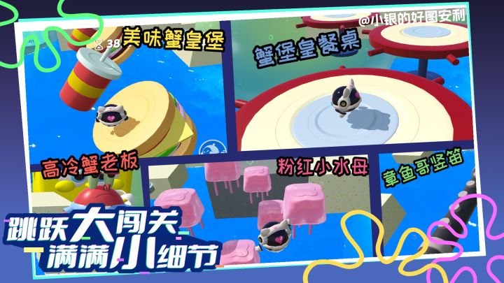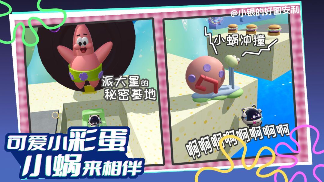 除了关卡设计,在闯关的场景也是细节满满,一路上你可以看到🍬水母外形的小蹦床,🍔汉堡和🥤可乐外形的跳台,以及🦀蟹堡皇同款餐桌。