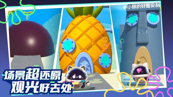 在地图内,你可以看到高度还原的建筑——🍍海绵宝宝的菠萝屋,🐙章鱼哥的家,🥥还有派大星的小窝。派大星的家甚至会在你接近时【自动打开】,观光的时候一定要靠近看看,体验一下派大星家的“等离子电视”哦~📺❤️