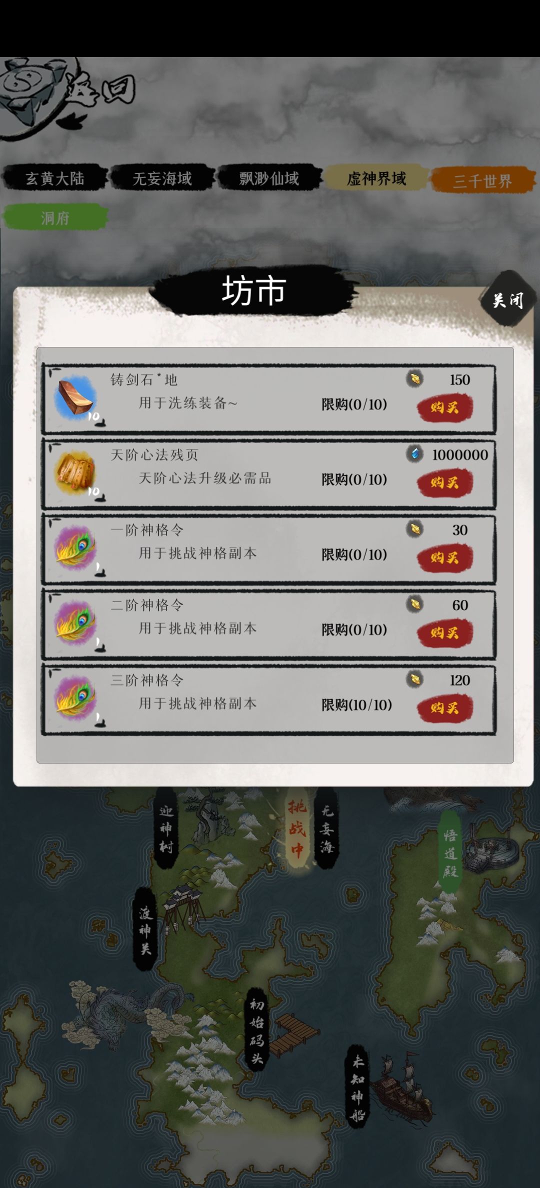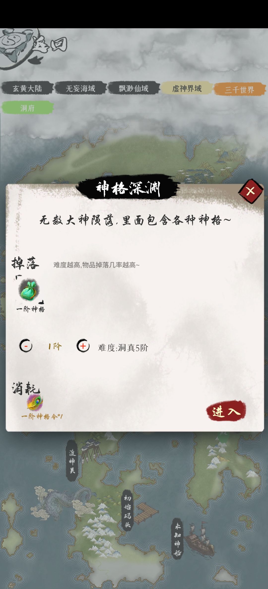 神格镶嵌数量可通过挑战洞府的神殿提升(挑战有等级限制),神格可通过图四挂机,商店以及天坊购买,积分兑换基金等方式获得,神格可以二合一,或分解为两个次一级神格,可以通过一建转换将神格转换成一种神格