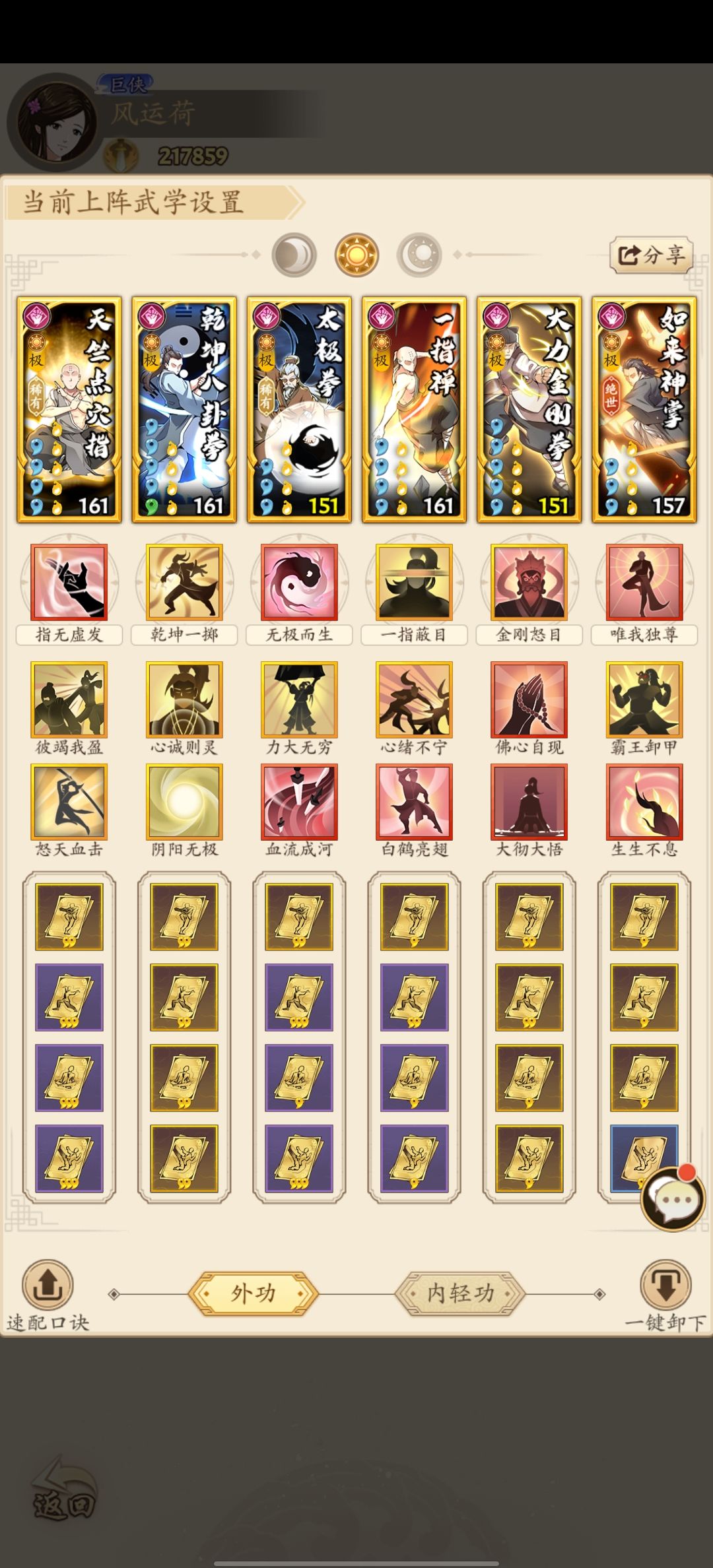 这套玩法有点看运气的成分,我觉得这样才有意思,稳扎稳打没有激情。流派如下图(招式应该有更好的,但是我就这些破烂凑合用了):