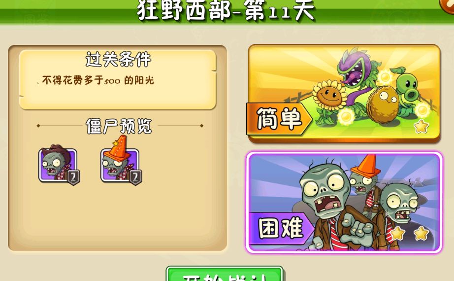 故事发生在狂野西部——某个气候炎热干燥,充斥着牛仔僵尸的国度。首先我们先来了解本关的通关条件。通关条件:这个关卡的话又是一个特殊关卡,在植物大战僵尸2狂野西部第11关,玩家过关不能花费多余500的阳光,和普通模式不一样的是,困难模式是没有小推车的,意味着我们只有一次机会。这个关卡难度还是比较大的,那就跟着小布来看,怎么在花费限制的情况下通过此关。