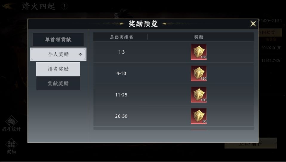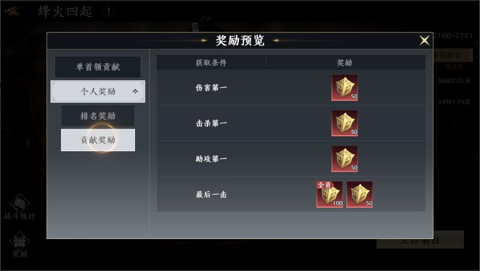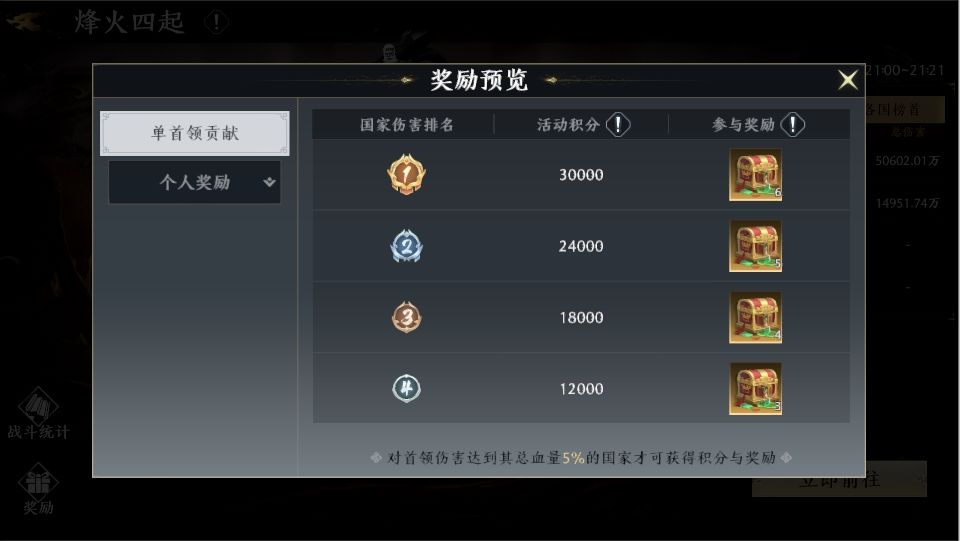 个人奖励:个人奖励分为两方面。一方面是参与奖励,需要玩家对boss造成的伤害达到一定要求,才可在最终结算时获得本国的参与奖励宝箱。另一方面则是个人伤害排行奖励,根据玩家对boss造成的伤害最终在排行榜中的位置来发放。