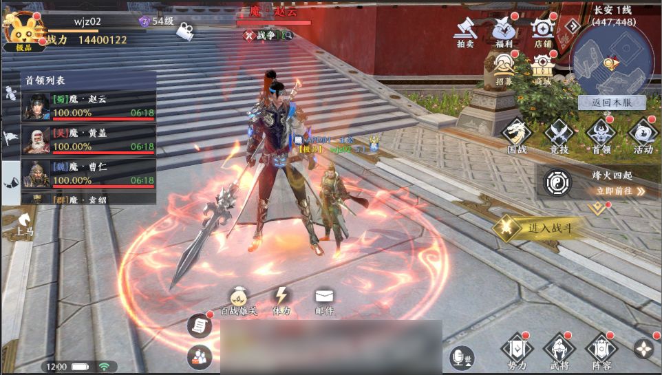 玩家可以在“烽火四起”活动页面的“立即前往”按钮行至所选的方位坐标参与战斗。移动至BOSS附近后,会出现“进入战斗”按钮,点击该按钮,即可进入该首领的战斗房间战斗,在boss存活/剩余时间不为0的情况下,玩家可以随时进出,并且伤害记录不会随着离开丢失。