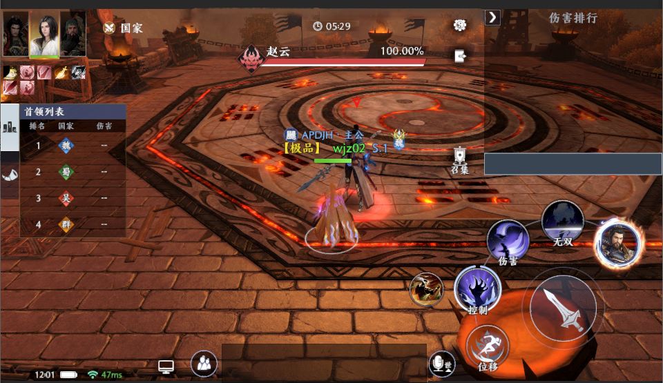 在首领房间中,仅存在“国家模式”,玩家仅可攻击其他国别的玩家,其中,可进攻的玩家名字为红色、不可进攻的玩家名字为蓝色、自己名字显示为绿色。