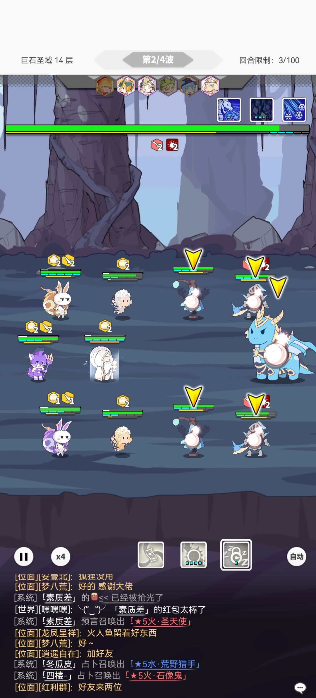 今天战力刚过4500于是挑战了巨石14,用兔队,光老头我睡眠吃到了冷却减一目前4回合cd,于是开创了无限睡眠流,睡眠不到25血以下不会醒