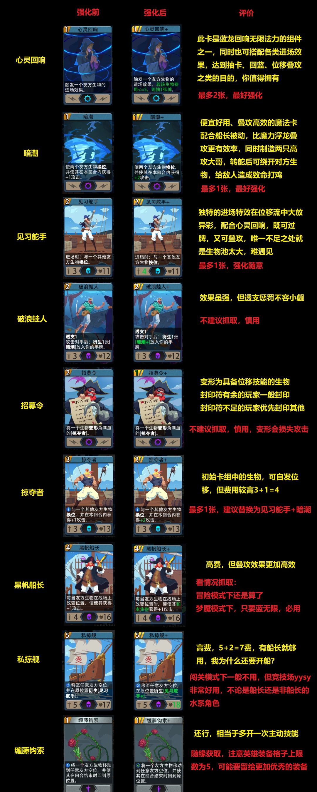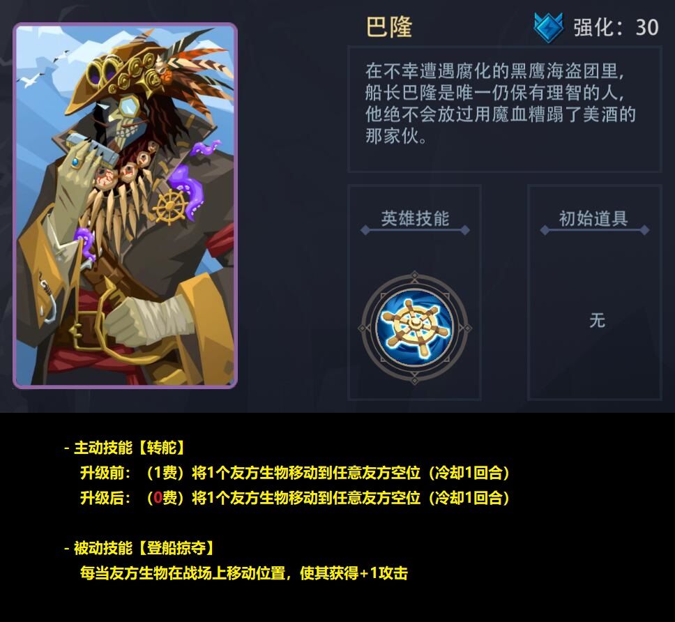 个人推荐度:高,水系英雄强无敌,水系卡组No1船长的蓄爆能力很强,是血少英雄的噩梦,竞技场能排入T0,但冒险模式中(主要是高难度下)一般被压着打,得靠脸拿到核心生物打出combo,请大家谨慎游玩。希望看了这篇文章,没玩过船长的小伙伴能获得了解,玩过的小伙伴也可以提出自己的见解,欢迎在底下评论区留言
