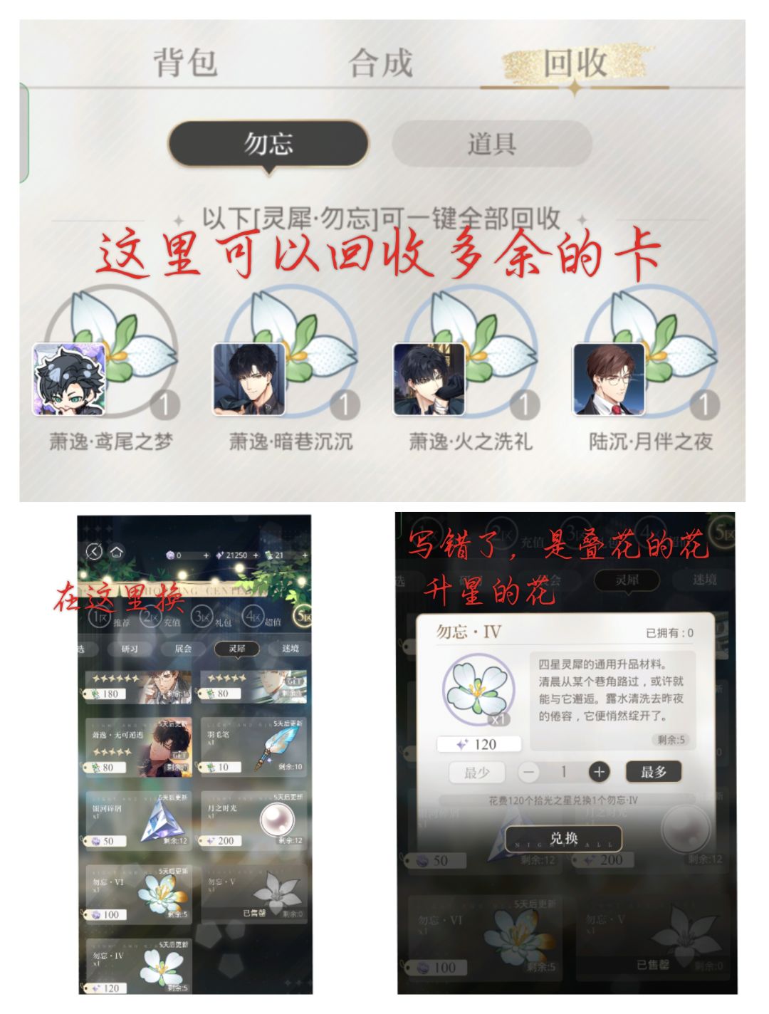 ①重复的卡可以叠花,或在卡池商店(灵犀)兑换花花叠花(不懂如下图)