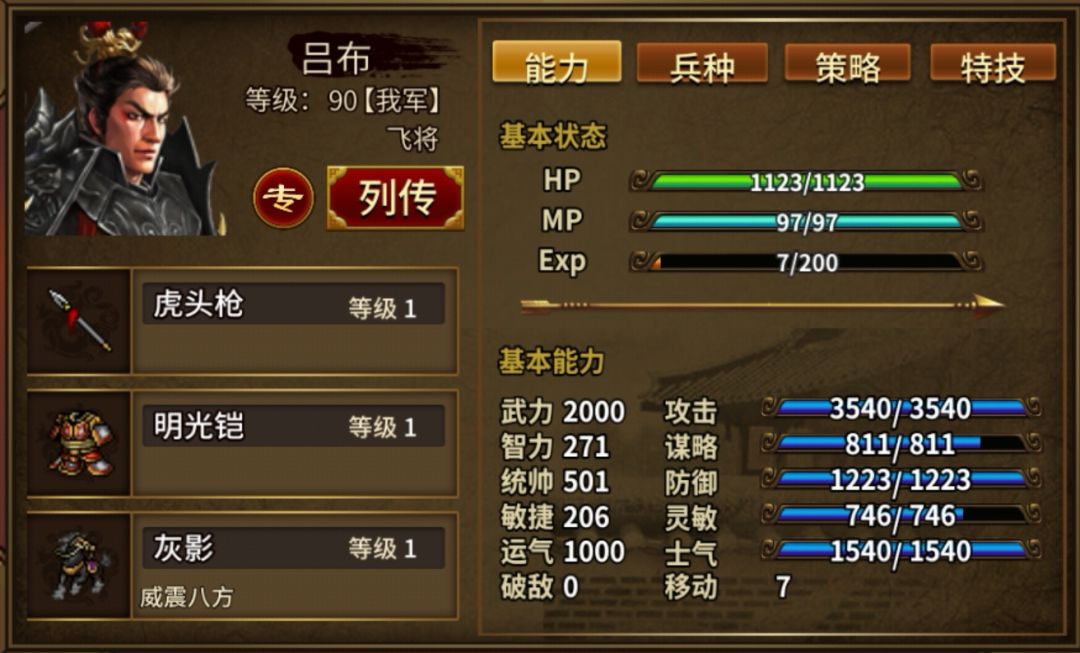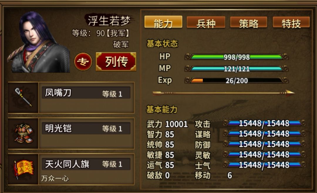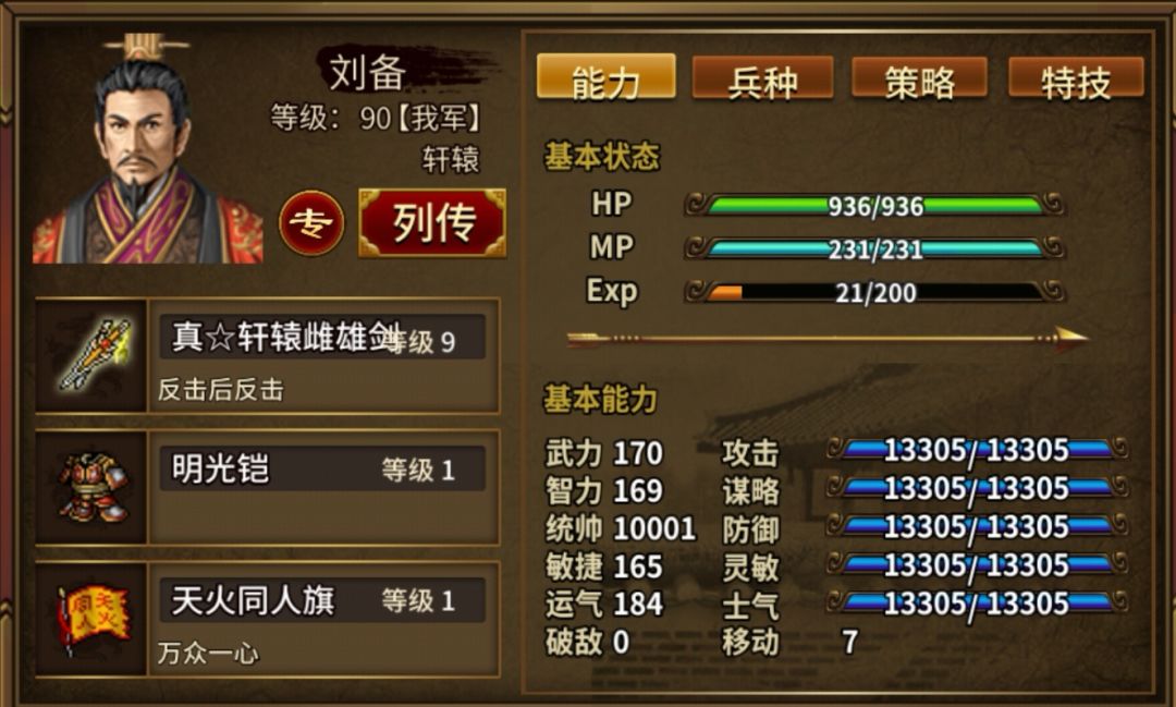 4、天火同人旗4个+吃适当士气果,非常重要,战场时所有人面板士气≥1122(小兵士气374×3),确保反击100%暴击,旗由非枪武将(如刘备、浮生等)装备。每个旗+20%士气,4个共+80%,即武将面板士气需培养到≥624。也可带3个旗,武将面板士气需培养到≥702。注:若不能暴击,需吃更多攻果。