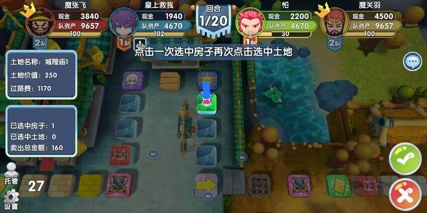 ,但是玩的好打电脑可以来反向克制。开局要决斗真张飞然后卖房子。如果真张飞丈八暴击那就直接反击,丈八大力暴击72;或者大力丈八+双股,两下不暴击。30+20乘以2,剩了两滴血。如果第一下不暴击第二下暴击那运气不好没得玩(电脑都傻的很,应该不至于运气那么好)。然后如果是丈八直接暴击你剩余30血,那就六进陷阱把自己强行卡1血。剩两血那种卖房子然后直接扔色子就好。然后真关羽和真张飞分别开始决斗,都不付钱。(额外+25防守血量有房子的话会再多个10血),可以看到第二张图上防守就只有26血,保证能丈八一下打死真关,就算真人真关你都拿我没办法。
