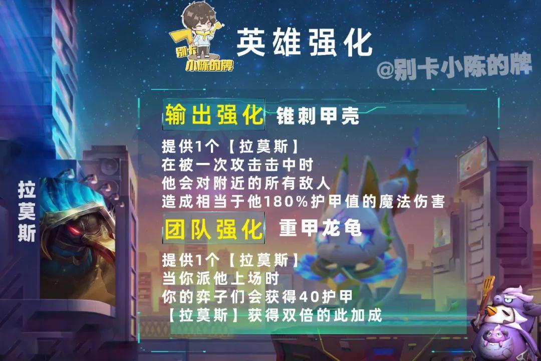 推荐大家优先选择卡莎或者薇恩或者各种怪兽英雄强化,这套阵容的好处在于多种英雄强化都适用,即使拿到了艾希的团队强化或者伊泽瑞尔的输出强化都可以玩,其次就是怪兽强化也是可以作为首要选择,都可以轻松变换阵容