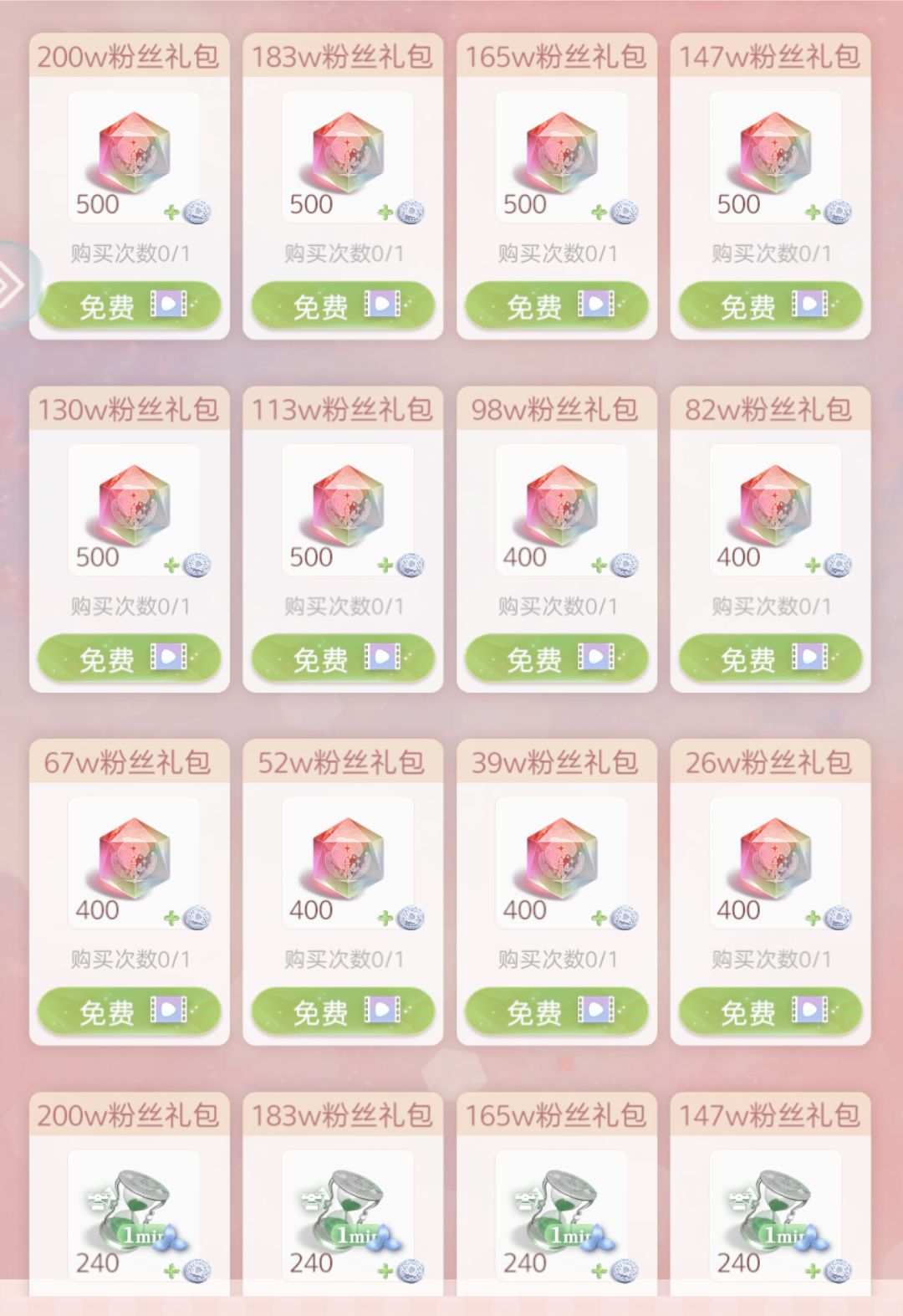 广告务必都看完,无论你是否需要这个奖励,也要全看完,因为一个广告有一个币。每周可以换两次(70币换40礼品卡),这个是最划算的,特别是后期的粉丝广告(粉丝广告追加到了200w)以及新手奖励都没了,后期的,每周换80个礼品卡就是你主要的获取礼品卡的方式了。