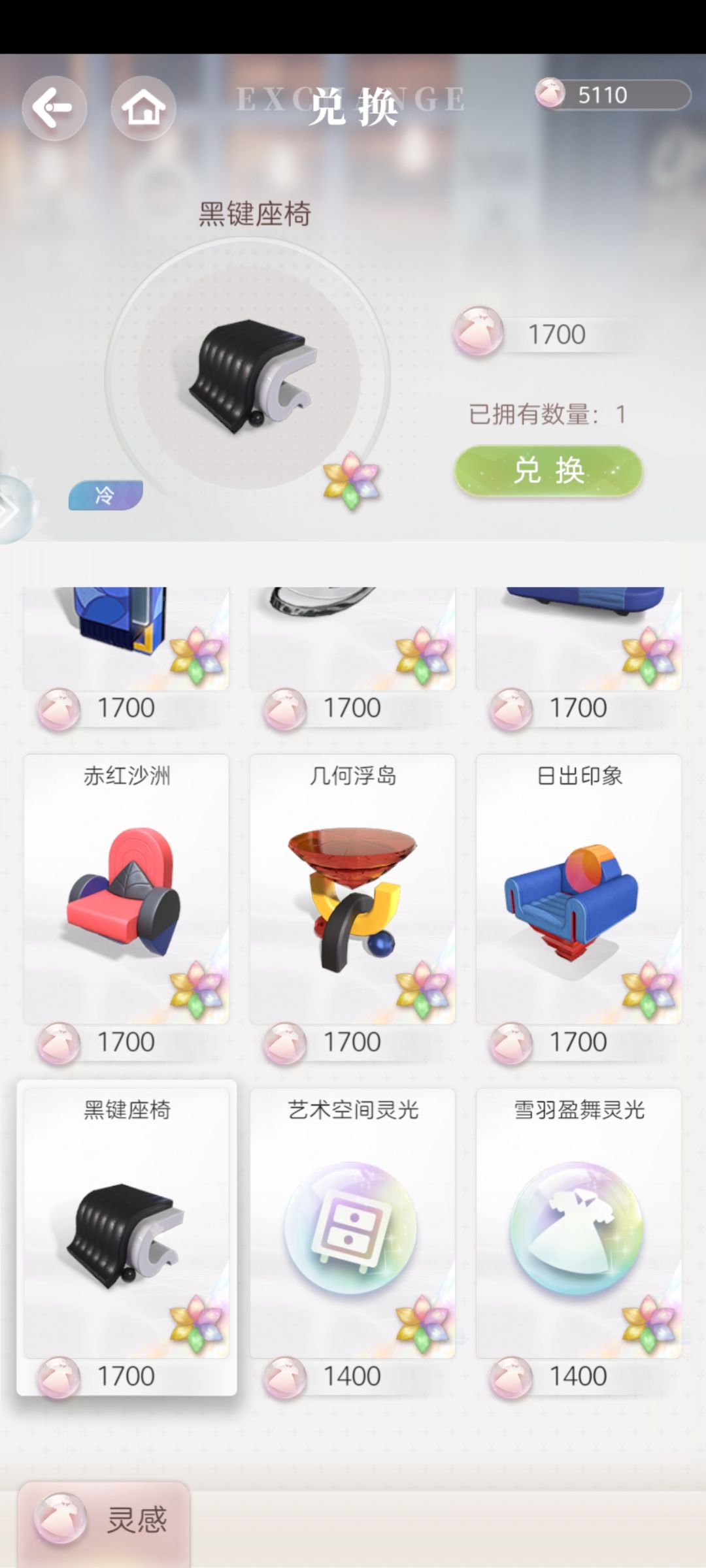 商城里有两套家具,建议先把两套每个家具换1个凑成套拿奖励,后面的两个灵感,似乎是还没出的,目前游戏内没有找到