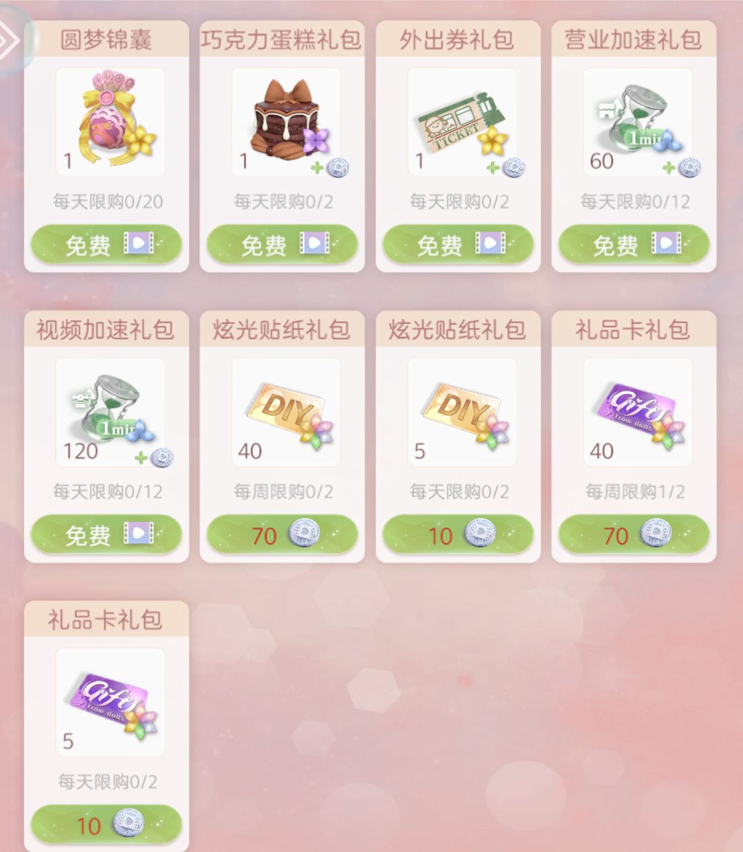 ↑如果每周换完40张的礼品卡,多出来的换每日10张的礼品卡,不要换前面两个炫光贴纸!超级不值!!!(更新后多了很多广告,每日的礼品卡也可以领完,建议的换取方式:每周领两次70币40张礼品卡,剩余的领10币5张礼品卡)
