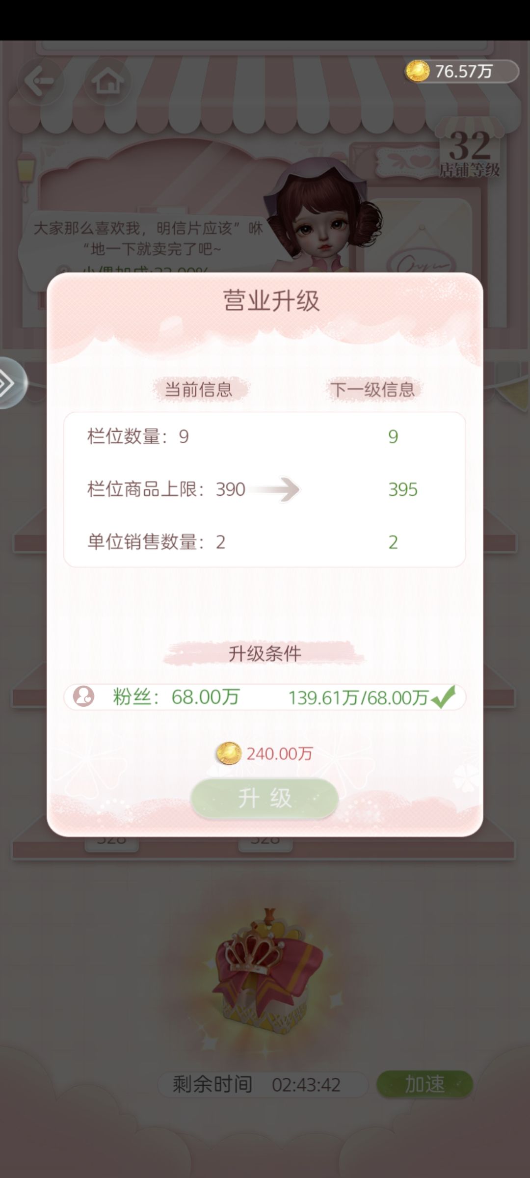 小铺升到足够用就行,不用升满,其实大多数的金币获取是靠完成订单,溢出的金币去抽材料,我甚至加速器都剩下好多