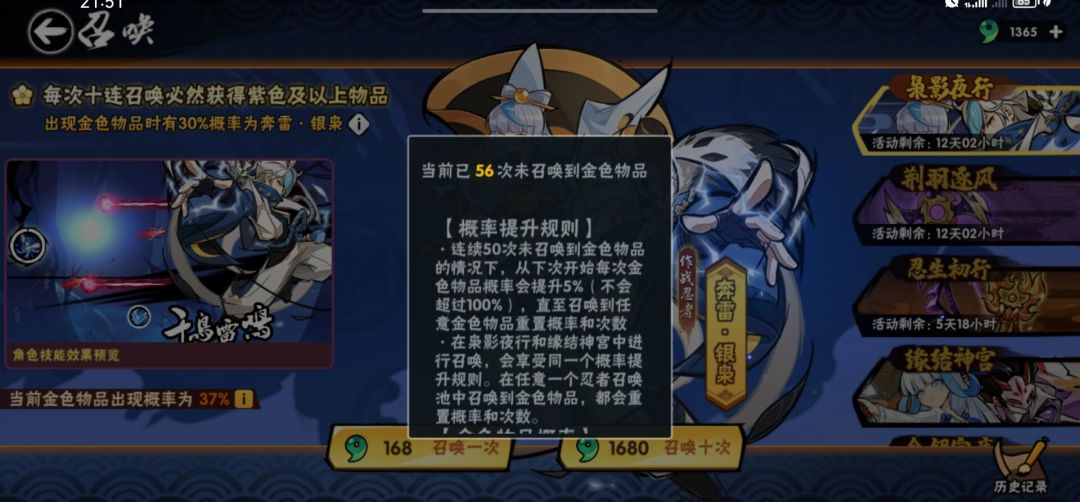 忍三官方推出的活动,50以内,抽中金色的概率是2%;如果一直不中,概率递加5%,如第51次是7%,52次是12%,那么问题来了,各位觉得到多少就(几乎)一定会出?