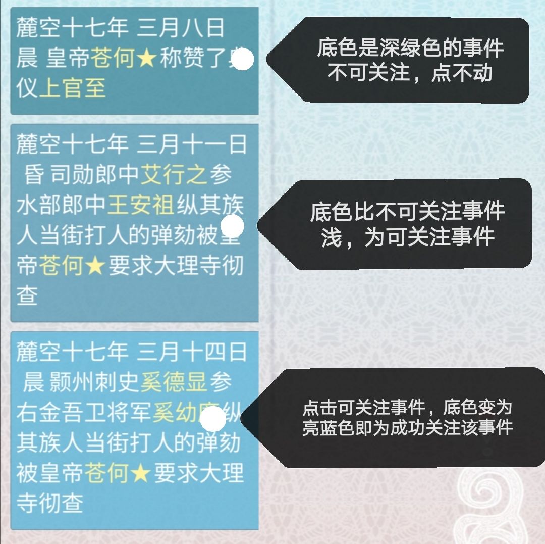2.关注事件:点开某个人物面板,打开履历,点击左边的履历里的事件即为关注,设为关注的事件将提前3天在 “待发生”栏出现(需要在事件发生的3天前关注,否则不显示);