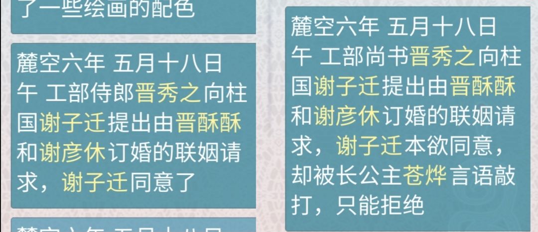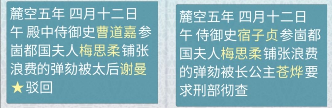 ⅰ批奏折:权臣操作。影响力高于母后和弟弟时,能抢在母后和弟弟之前把折子批了,关注参XXX事件(如上图),会有“支持”(要求彻查)和“阻挠”(驳回)的选项(每一世奏折随机性太大,我刷了母后履历里大半年的折子才命中一个,图为选“支持”的结果……当时误以为“支持”是支持母后的决断的意思);
