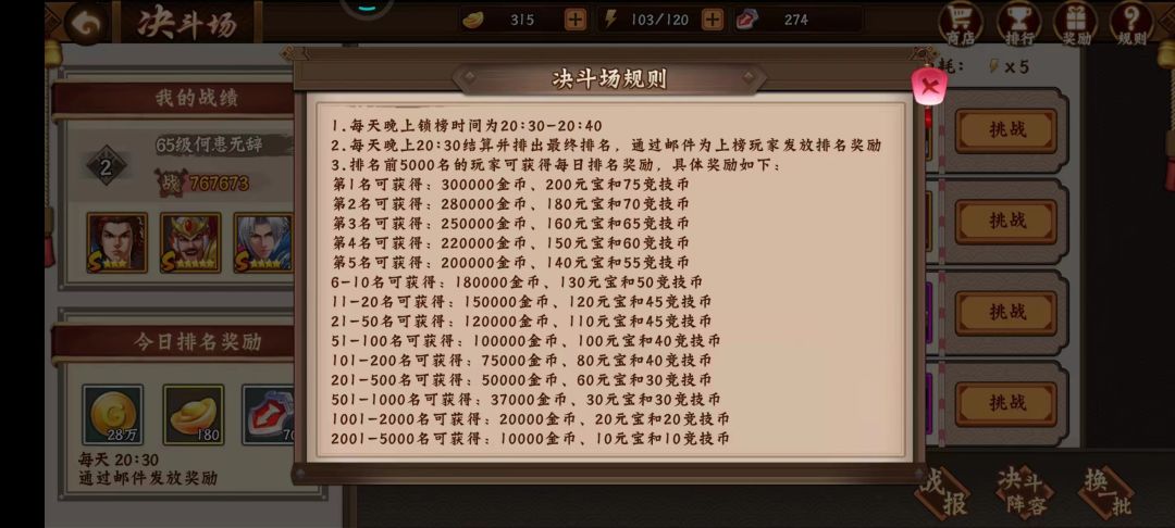 决斗场,每日元宝大头来源之一。排名越高越好。