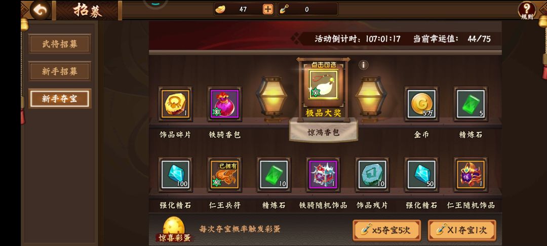 常规池80次出一个,随机!!!第一个四十次。会重复!!!不建议砸元宝。另,48小时送一次高招。配合一命通关慢慢白嫖就行。