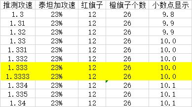 剑神基础攻速显示是1.3由于四舍五入的关系可能是1.25到1.34之间的任意数,值所以为了获得更精确的攻速值,用泰坦和战旗两个装备搭配测得。过程和结果列表如下黄色标记的是和实际情况相符的结果